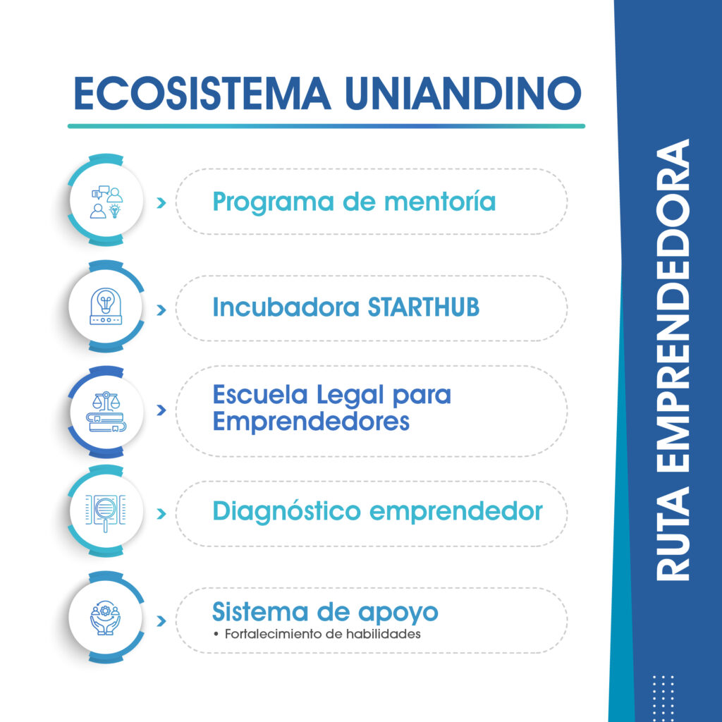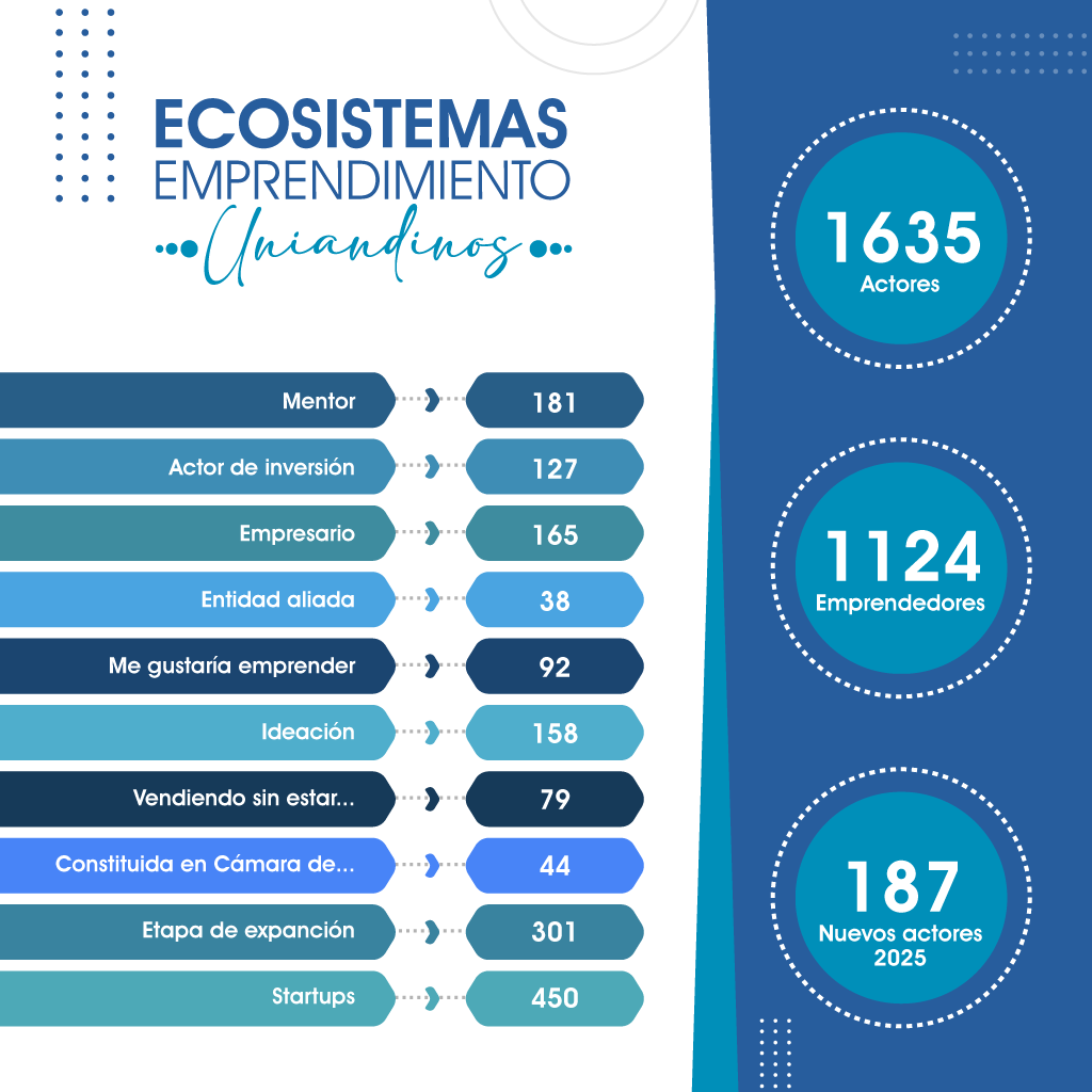 El área de emprendimiento trabaja por consolidar todo un Ecosistema de Emprendimiento Uniandino identificando, caracterizando y enlazando a cada uno de sus actores (emprendedores, empresarios, mentores, inversionistas y entidades de apoyo) que permitan la potencialización del emprendimiento uniandino hacia Colombia y el mundo apalancando el crecimiento acelerado y conjunto de los emprendedores existentes.”